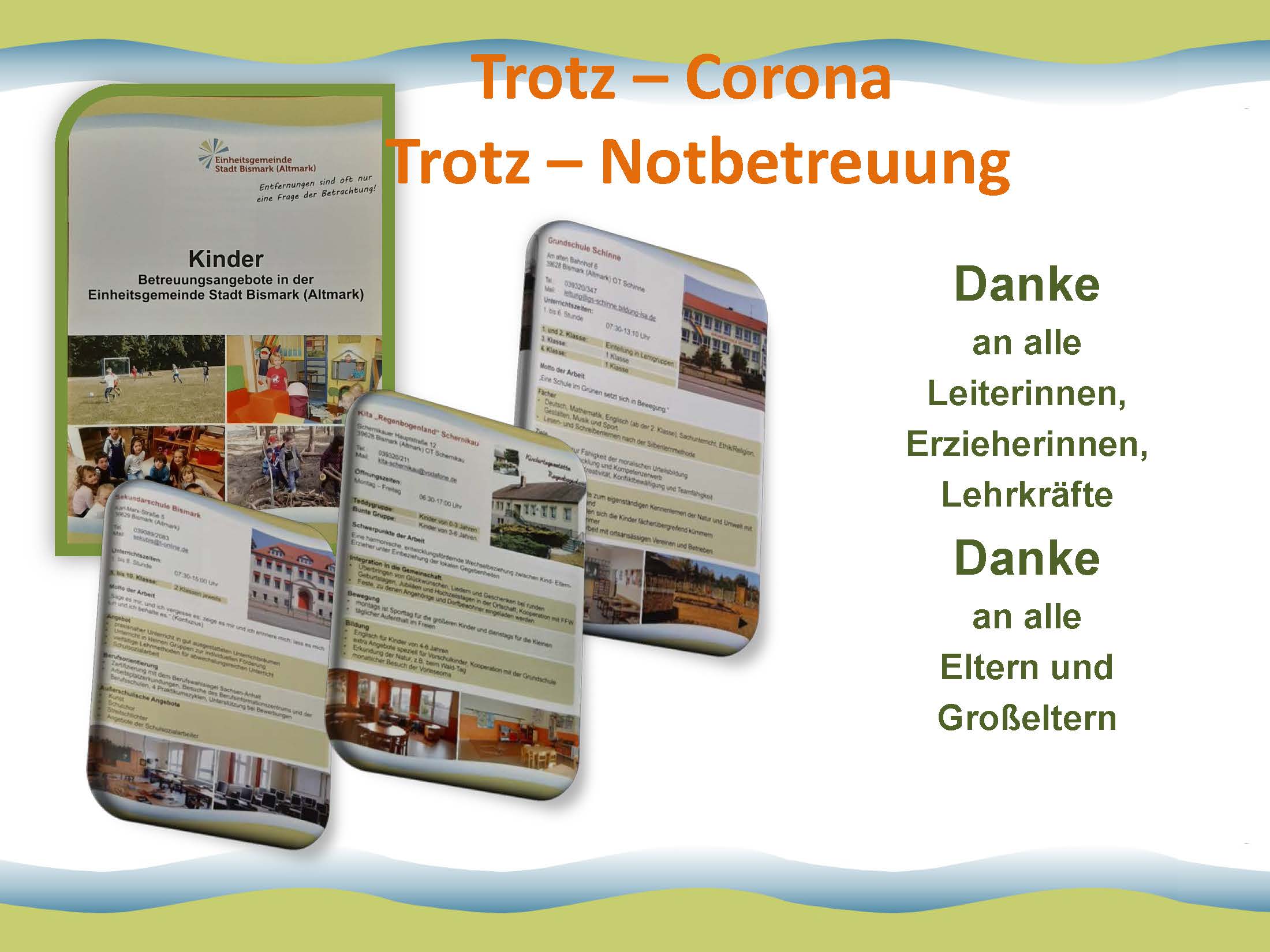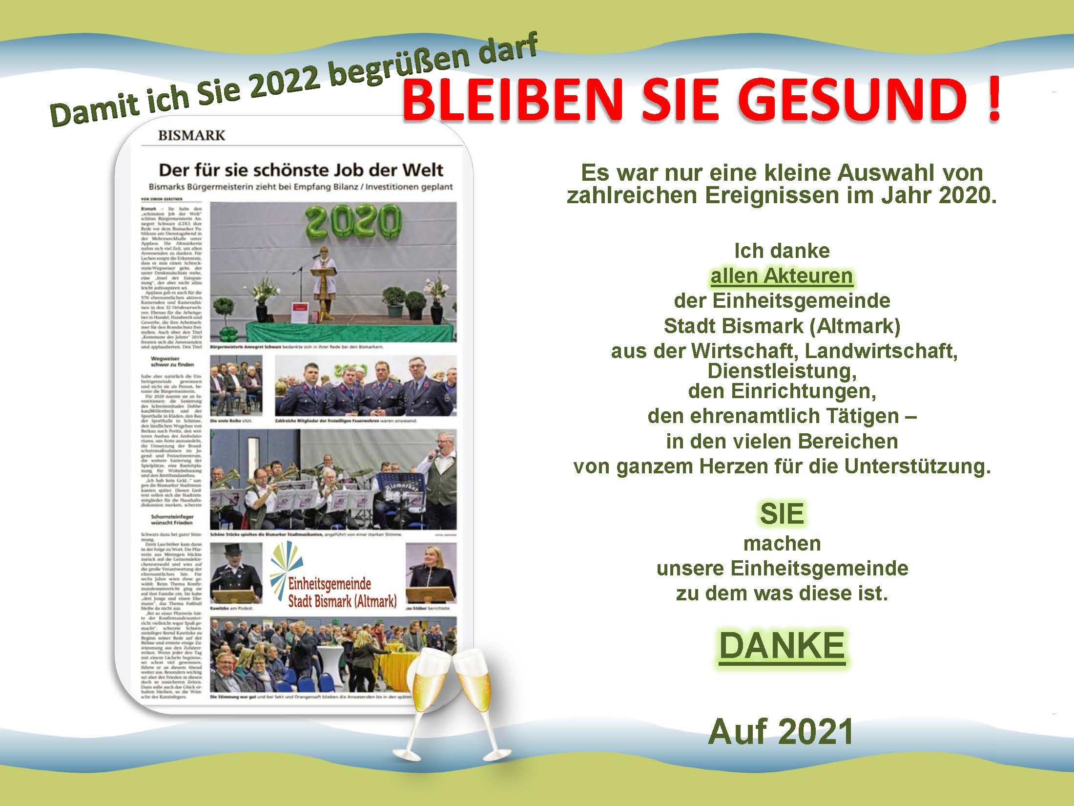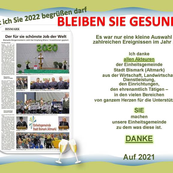 Und trotz aller Negativmeldungen ist es uns gemeinsam gelungen, die Einheitsgemeinde Stadt Bismark (Altmark) mit ihren 39 Ortsteilen, 8.120 Einwohnern, im 10. Jahr ihres Bestehens, weiter zu gestalten.