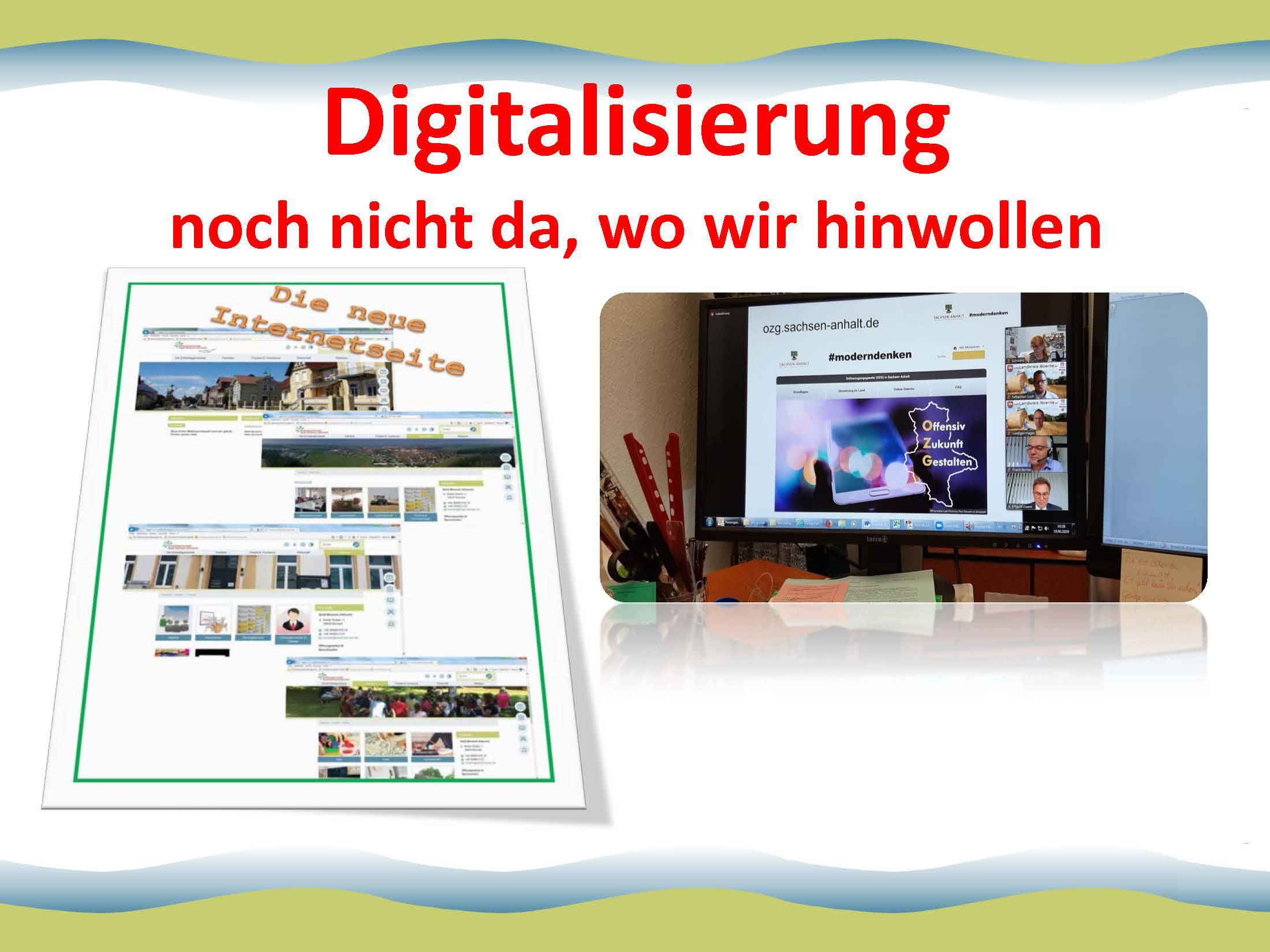 Das integrierte ländliche Entwicklungskonzept für die Einheitsgemeinde wurde 2020 nicht erstellt. Das wird eine große Aufgabe für 2021 / 2022 sein. Ihre Ideen und Mitarbeit werden dabei gefragt sein. Ich komme auf Sie zu.