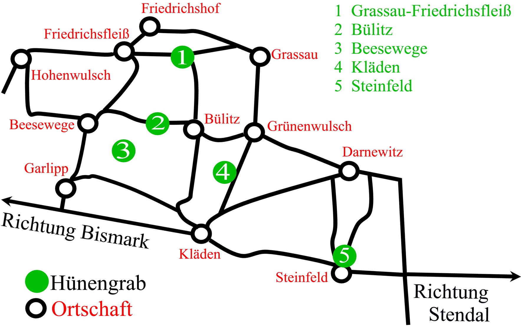 Zu den Hünengräbern Gesamtlänge: ca. 20 km Streckenführung: Kläden - Steinfeld - Darnewitz - Grünenwulsch - Bülitz - Beesewege - Kläden |