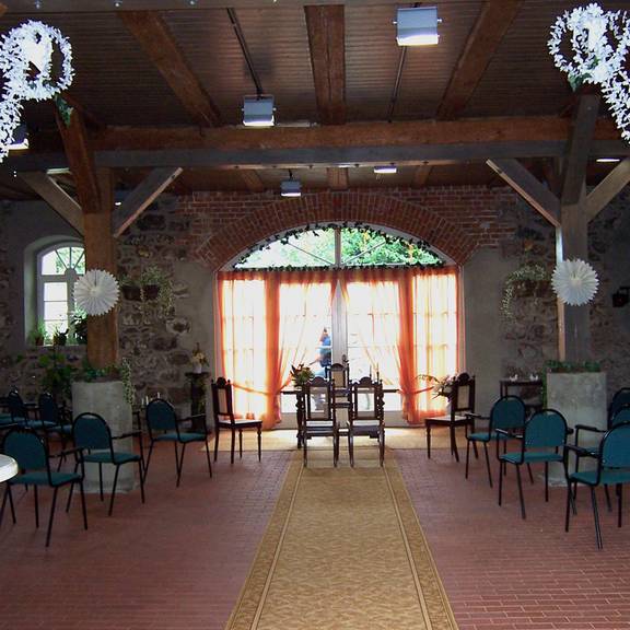 In dem urig restaurierten Gebäude kann sich das Brautpaar vor bis zu 75 Gästen in ländlich-festlicher Atmosphäre das Ja-Wort geben.