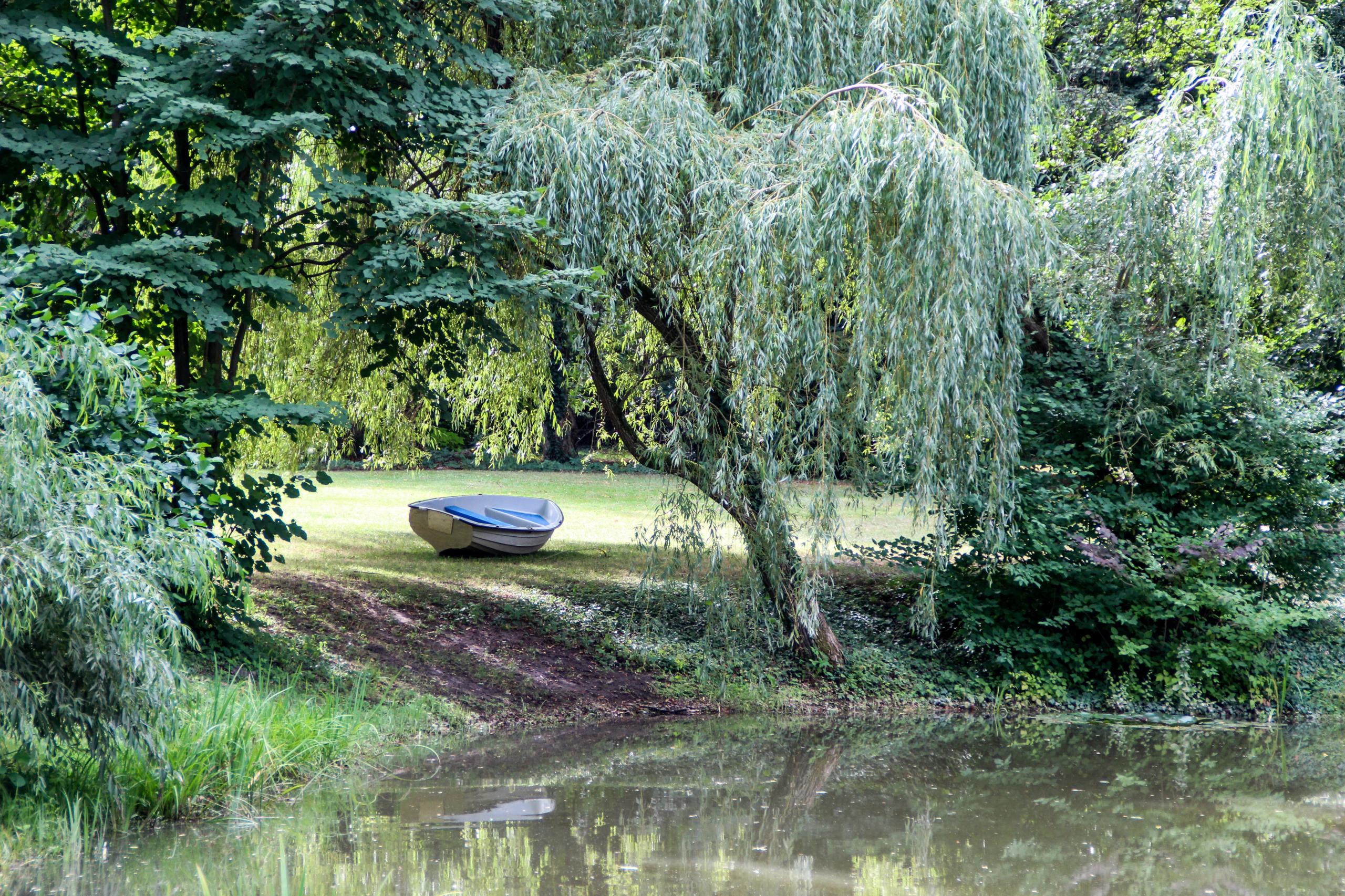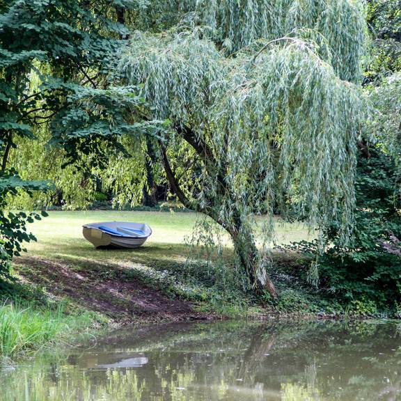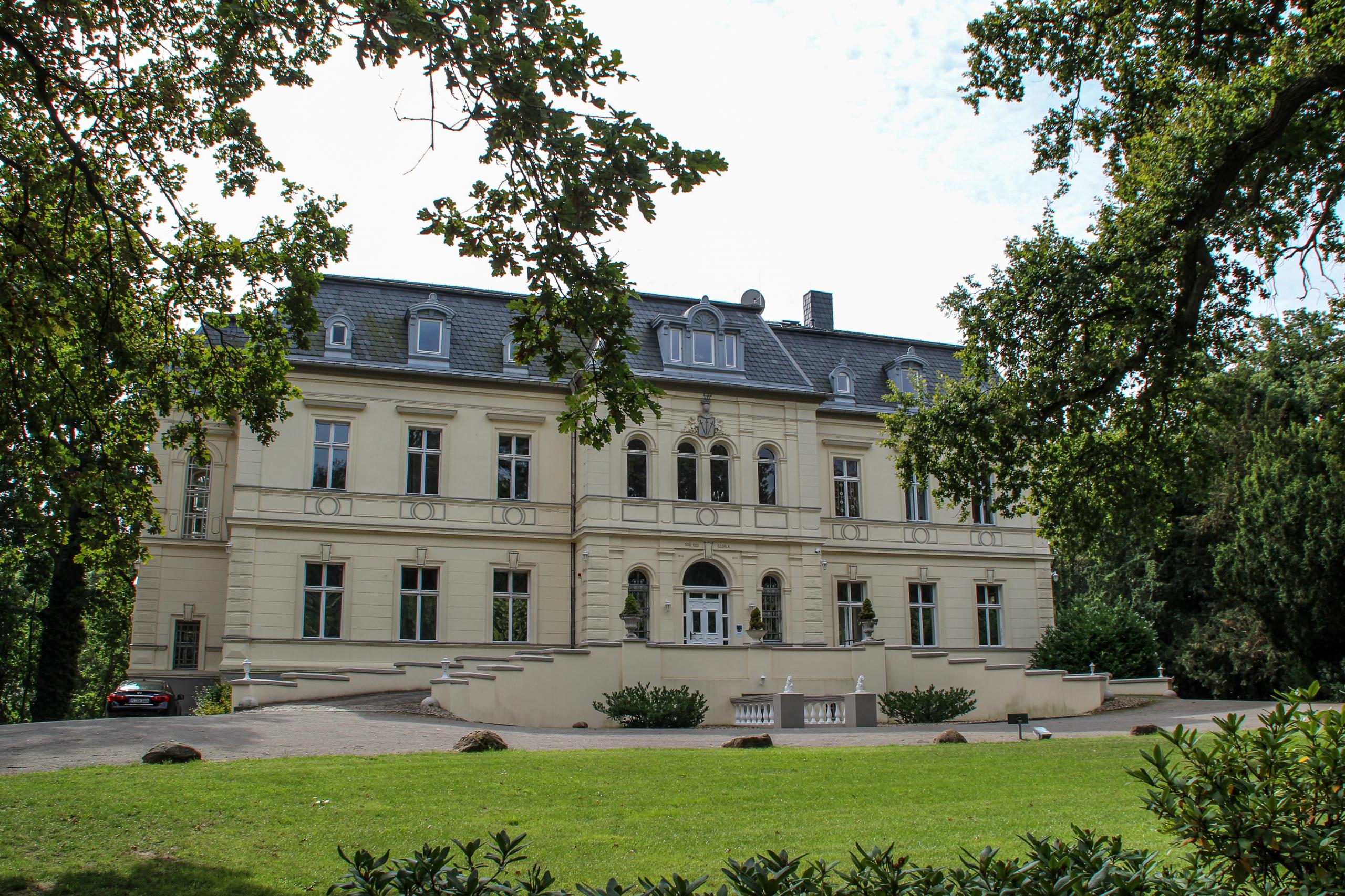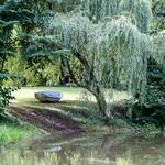 Schloss und große Parkanlage mit seltenen Gehölzen, wie Mammutbäume, kleine rechteckige Feldsteinkirche mit barocker Deckenmalerei von 1725